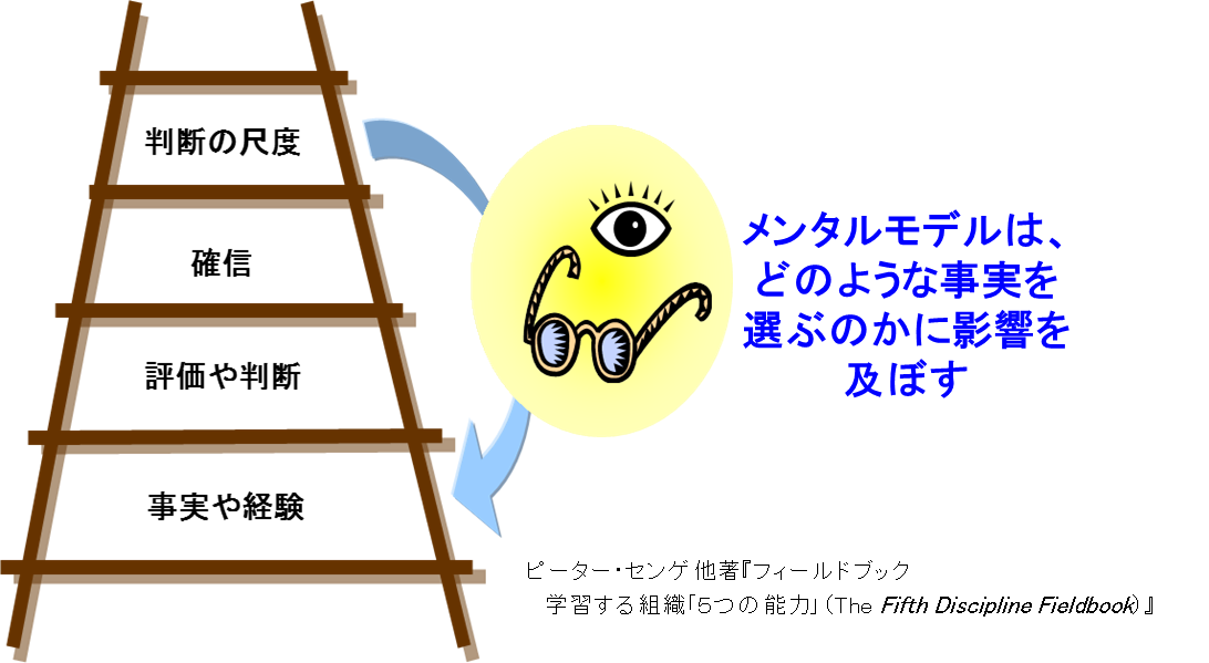 大人の場合は、少し事情が違います。すでに、失敗の経験を持っているからです。では、成人した大人が、リスク許容量を上げるためにどうすればよいのでしょうか。そこで、重要な役割を果たすのが、メンタルモデルを活用する力を身に付けることです。先ほど脳科学の視点で説明した感情と思考の関係を、「学習する組織」では、推論のはしごを使って説明しています。メンタルモデルを簡易的に5段のはしごで紹介します。1~2段目は、これまでの経験、2~3段目は、これまでの経験で行った自分の評価判断、3~4段目は、これまでの経験とその際に下した評価判断から手に入れた確信、4~5段目は、経験や評価判断を通して手に入れたものの見方、尺度や価値観です。私たちが、物事に対して判断を下している時、無意識のうちに、この推論のはしごを使用しています。同じ映画を見ても、人によって違うシーンが最も印象に残るのはこのためです。私たちの中にある推論のはしごが、情報を取捨選択していメンタルモデルるのです。