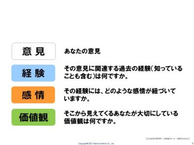 また、多くの人々は、人の話を聴く際に、意見の背景にある経験、感情、価値観に意識を向けていません。この時、多くの人は、無意識に、人の意見に、自分の経験、感情、価値観を当てはめて、自分の解釈を加えて、相手の話を理解したと思い込んでいます。このため、実は、相手の話を本当に理解している確率はとても低いです。