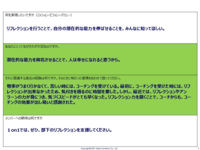 自身のビジョンを語った後は、部下のビジョンを引き出します。その際にも、認知の4点セットを活用することができます。「何に取り組みたいのか。何を実現したいのか」やりたいことを尋ねた後に、なぜ、そうなのかを、経験、感情、価値観レベルで質問することで、部下が、リフレクションを通して、自分がやりたいことを明確にし、自分ごと化させることが可能になります。