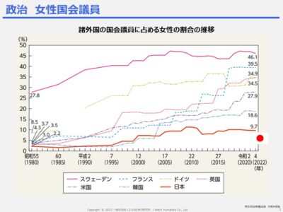 世界では、女性役員比率4割を目指しており、係長級の管理職比率3割を目標にしている日本とはかなり様子が違います。また、政治についても、世界は、1980年代から女性役員位率を高め続けており、日本とはかなり様子が異なります。