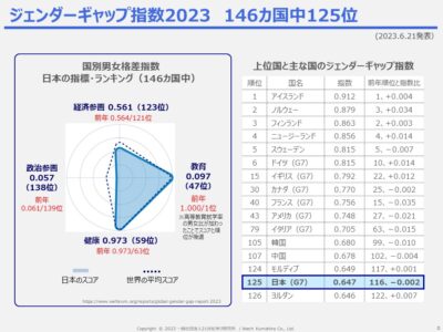 共働き社会へのシフトが進み、保育園の送り迎えに参画するお父さんが増えている日本にいると、女性活躍推進は進んでいると感じますが、残念ながら、世界との比較では、日本の順位は下降傾向にあります。毎年発表されるジェンダーギャップ指数2023では、146カ国中126位となっており、韓国や中国よりも遅れている国という評価になりました。
