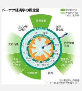 そんな中で、新たに「ドーナッツ経済学」という新しい経済学が、オックスフォード大学の経済学者ケイト・ラワース氏により2011年に発表されました。皆さんもご存知のドーナッツの形をした経済学のアイディアです。このドーナツには、2つの大事なコンセプトが含まれています。一つは、経済活動を、プラネタリーバウンダリーの内側で行うことです。現在のように、地球の限界を超えても、資源が枯渇するまで、自然資本を使い続けるのではなく、持続可能な地球を前提に経済活動を行うことを目指す経済学です。もう一つは、すべての人たちが、一定の生活水準を保ち、水や食料が不足し苦しんでいる人たちがいない社会です。富の格差も貧困問題も、地球から消滅します。