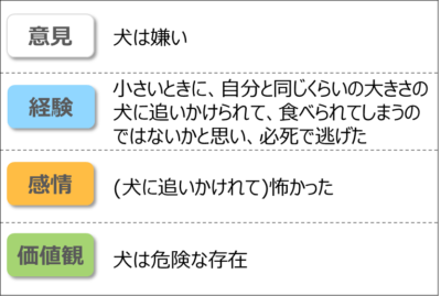 自分の意見の背景にどのようなメンタルモデルがあるのかを、意見に紐づく経験を思い出すことで言葉にすることが可能になります。例えば、犬が嫌いな人が、過去の経験を掘り下げることで、どのようなメンタルモデルが、その考えの背景にあるのかを探り当てることができます。「そういえば、小さいときに、自分と同じくらいの大きさの犬に追いかけられて、食べられてしまうのではないかと思ったとても怖い経験があった」こんな風に、過去の経験を思い出すことで、犬に対する自分の思考の背景にあるメンタルモデルに気づくことができます。